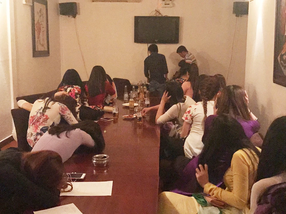 Tại 1 phòng, hơn 20 nữ tiếp viên đang xếp hàng, đi lại. Phát hiện lực lượng chức năng, nhiều nữ tiếp viên nhốn nháo bỏ chạy nhưng bị giữ lại.