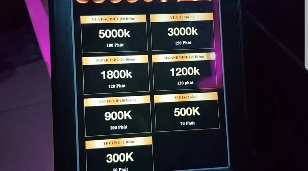 Theo quảng cáo, nếu khách mua vé 300 ngàn đồng thì được một nữ tiếp viên phục vụ trong 50 phút. Khách mua gói “vua đặc biệt” với giá 5 triệu đồng sẽ được 4 nữ tiếp viên phục vụ trong vòng 3 giờ, còn gói “siêu vua” là 13 triệu đồng.