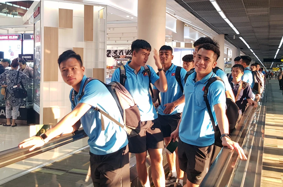 U-23 Việt Nam đáp chuyến bay đến Buriram, Thái Lan. Ảnh: VFF