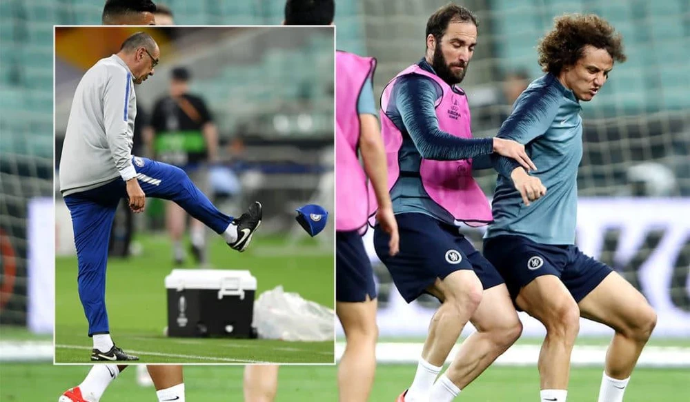 David Luiz và Gonzalo Higuain lao vào nhau tính chuyện “thua đủ” trong khi HLV Sarri bực tức bỏ đi tại buổi tập, Chelsea chuẩn bị tranh cúp vô địch Europa League với Arsenal.