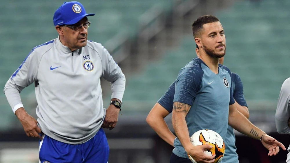 Đây cũng có thể là trận đấu cuối cùng, HLV Sarri và Hazard đứng chung chiến tuyến tại Chelsea. ẢNH: REUTERS