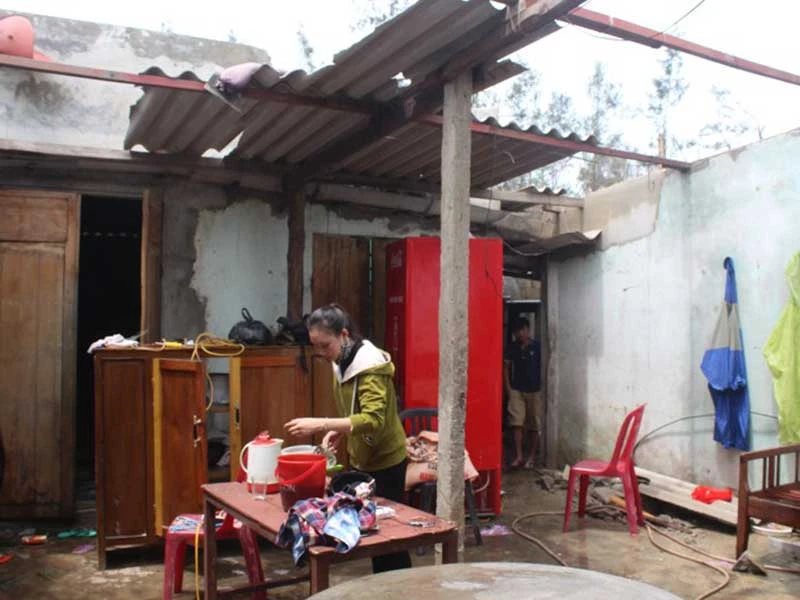 Nhiều nhà dân vùng biển thị xã Ba Đồn, Quảng Bình bị tốc mái gần như hoàn toàn. Có nhà bốn người con phải xin ngủ nhờ nhà của những người bà con. Ảnh: NGUYỄN DO