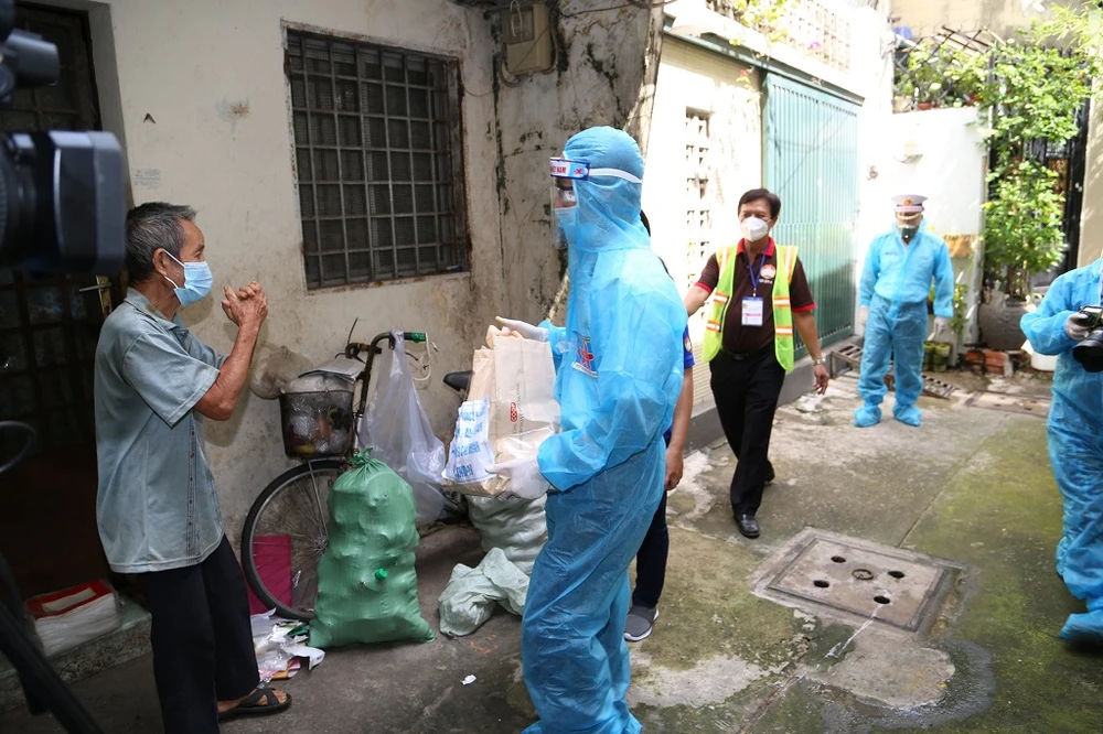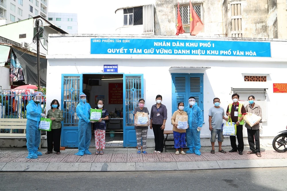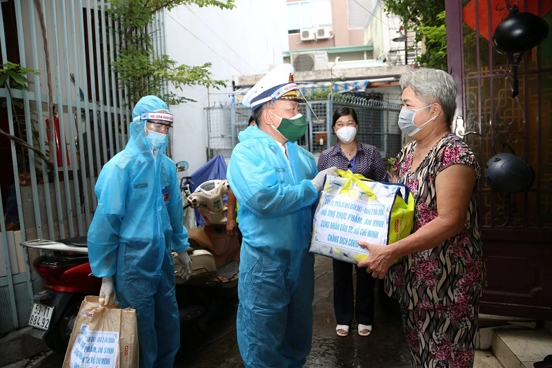 Ngay sau đó, các chiến sĩ Vùng 2 Hải quân đã đến thăm và trao các túi an sinh cho người dân ở phường Tân Định, quận 1. Ảnh: MTTQ TP.HCM