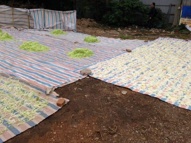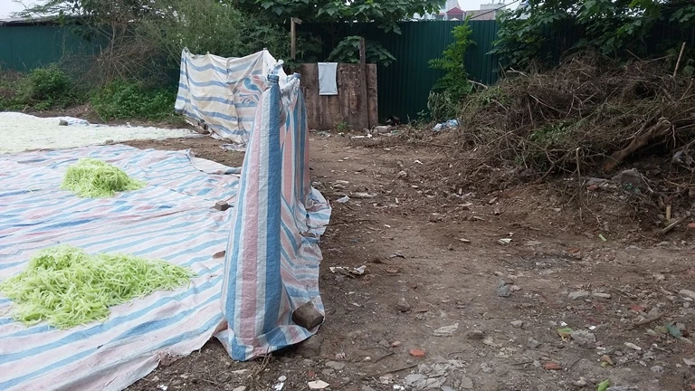 Cơ sở này phơi nguyên liệu làm mứt tết ngoài trời, không đảm bảo vệ sinh tại khu đất trống rộng hàng trăm mét vuông. Tại đây, hàng trăm ký bí và đu đủ đã qua sơ chế được phơi trên tấm bạt mỏng ngay sát mặt đất, bụi bẩn, ruồi nhặng bâu đầy và gần khu vệ sinh công cộng tạm bợ.