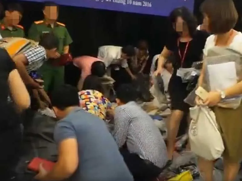 Nhiều người tranh vào nhặt đồ trong buổi tiêu hủy tang vật vi phạm hành chính về sở hữu công nghiệp. Ảnh cắt từ clip