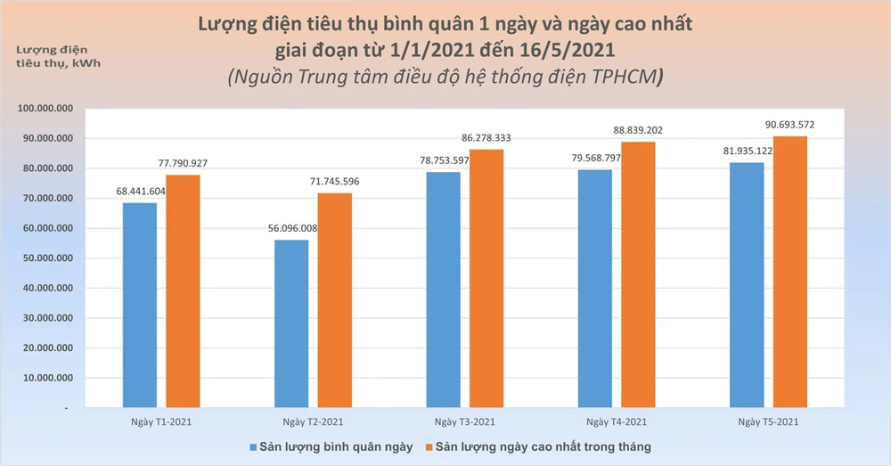 14-5, lượng điện tiêu thụ của TP lần lượt là 90,32 triệu kWh, 90,27 triệu kWh và 90,69 triệu kWh (cao nhất từ trước đến nay, vượt mức kỷ lục 90,038 triệu kWh được lập vào ngày 24-4-2019).
