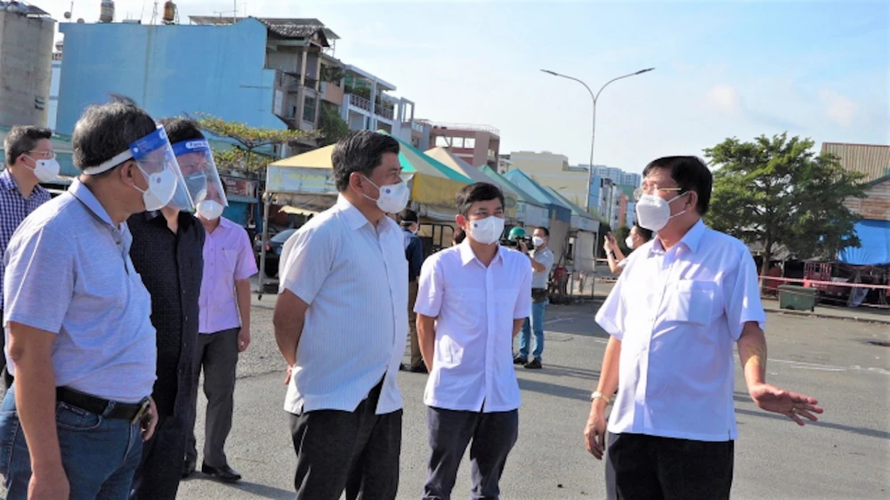 Thứ trưởng Trần Thanh Nam (thứ 3 từ phải sang) khảo sát tình hình tại các chợ đầu mối của TP. HCM. (Ảnh: Minh Sáng)