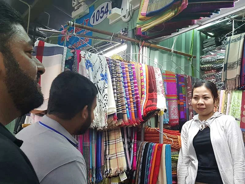 Có vài khách đến từ Malaysia tìm mua vải và khăn trùm đầu cho phụ nữ Hồi, các tiểu thương chỉ cho họ đến khu chợ vải. Chakela (đến từ Malaysia) cẩn thận xem vải, hỏi giá. Cô cho biết muốn đi tham quan và hỏi giá trước, chưa có ý định mua ngay. Ông Dũng bán ở sạp 1058 không phiền mà còn vui vẻ chỉ cho họ đến các sạp khác để lựa tiếp, không quên giơ tay chào: “See you again” (Hẹn gặp lại).