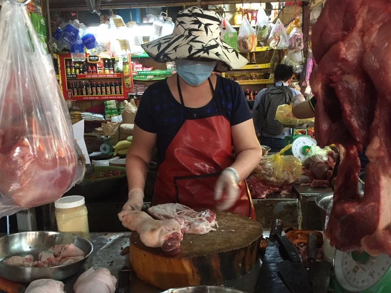 Tiểu thương ngành hàng thịt heo chợ Hoàng Hoa Thám không ngại mang khẩu trang.