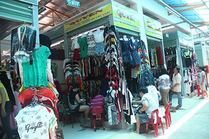 Qua gian bán quần áo của anh Phong, rất nhiều khách hàng đang lựa quần áo. Anh Phong đứng ngoài mời chào khách, hôm nay gian hàng của anh khai trương cũng giảm giá đến 20%.
