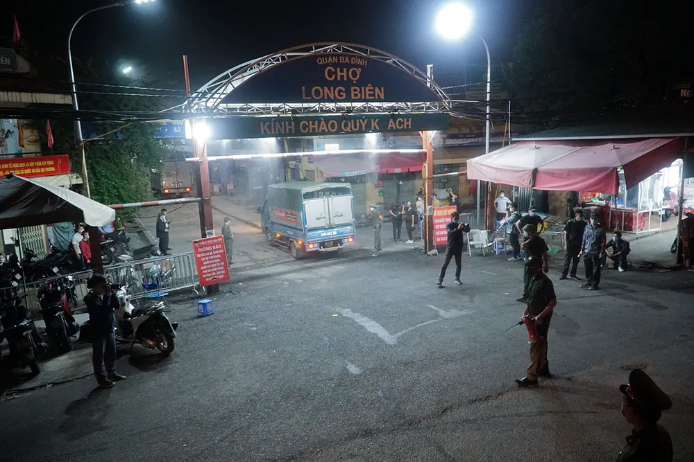 Những chiếc xe tải từ từ tiến vào chợ Long Biên sau 0 giờ ngày 21-10.