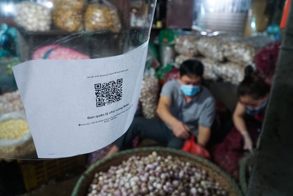 Tất cả các quầy hàng đều lắp tấm chắn giọt, và có mã QR để khách có thể quét khi tới mua hàng.