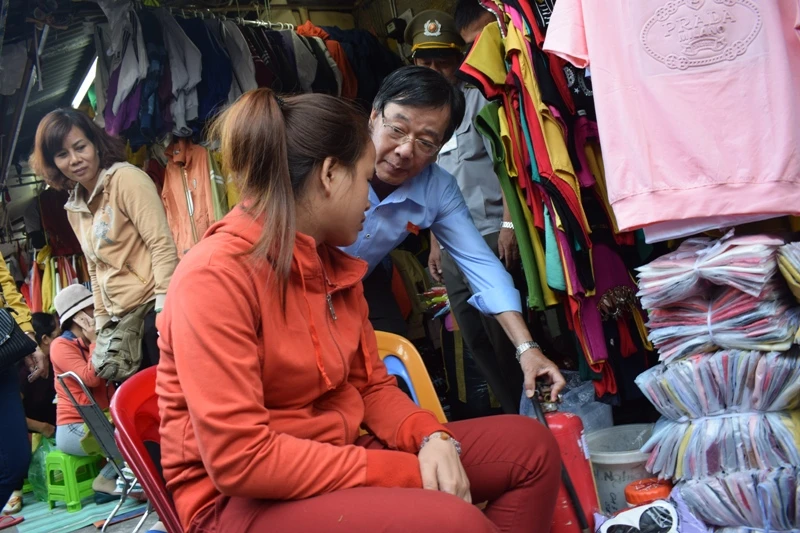 Ông Phạm Hiếu Nghĩa (áo xanh), Phó Trưởng ban Pháp chế HĐND TP, thị sát chợ Tân Bình. Ảnh: NGUYỄN TRÀ