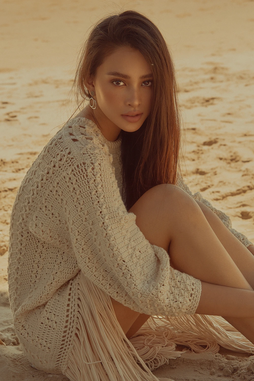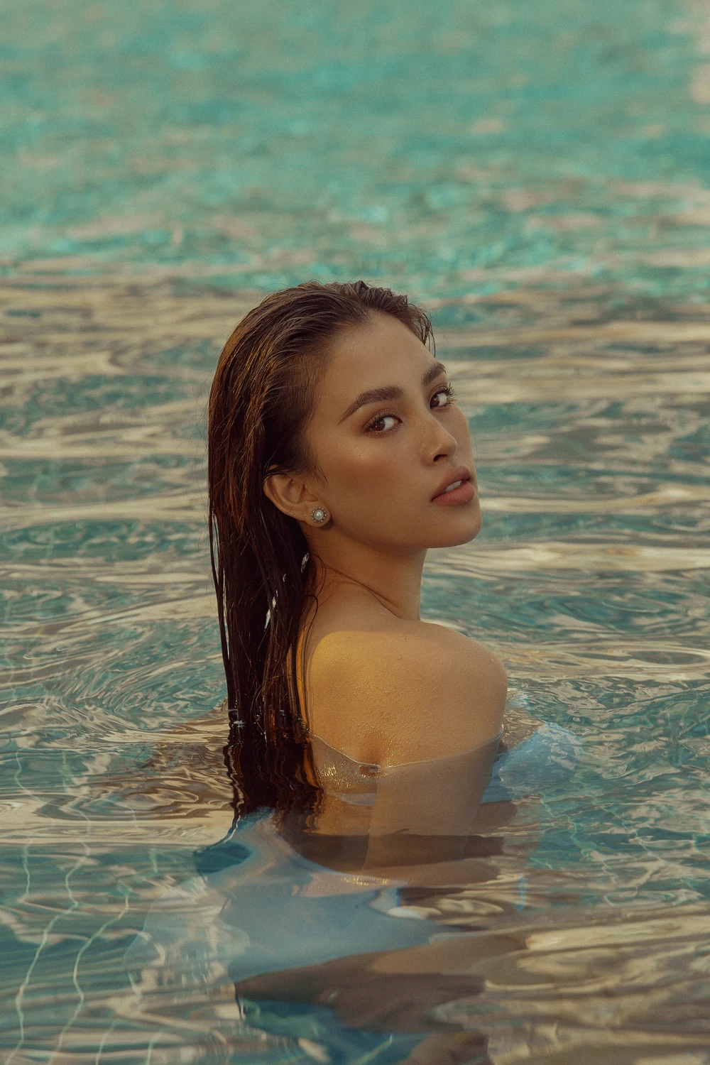 Bất kể trong bối cảnh bao quanh bởi kiến trúc đậm chất châu Âu, trên thảm cỏ xanh mượt, dưới làn nước trong xanh hay trên nền cát vàng mịn, Tiểu Vy quyết cân tất cả bằng ánh mắt hoang dại và không kém phần mơ mộng.