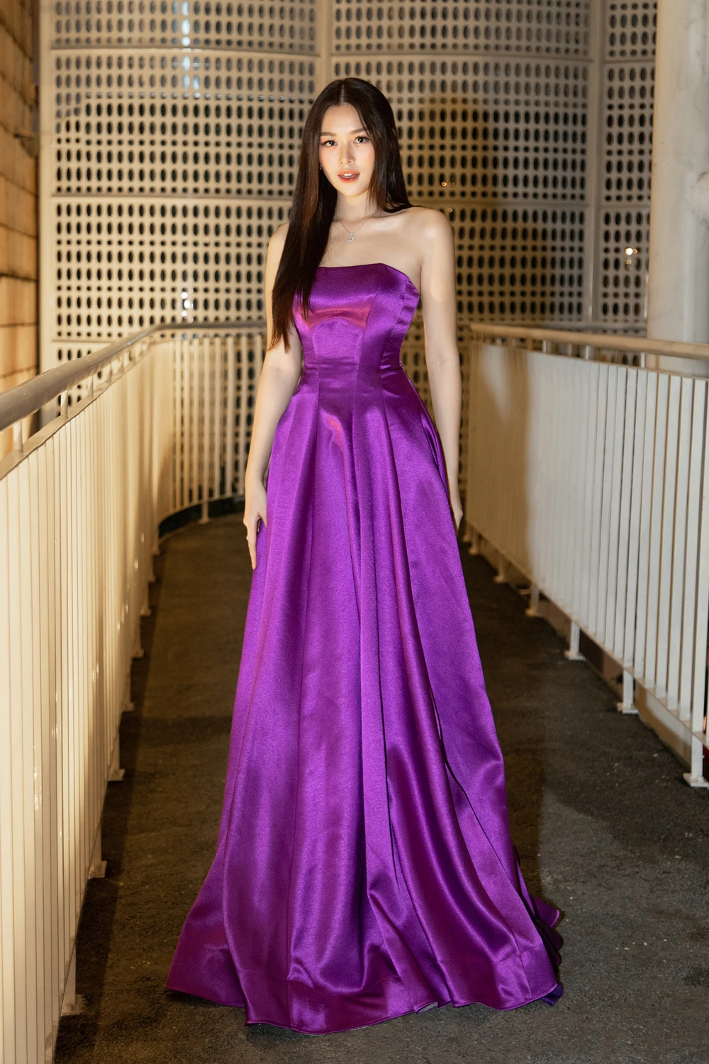 Trung thành với phong cách nóng bỏng, Tiểu Vy diện chiếc đầm dạ hội tím huyền bí với vòng 1 quyến rũ.
