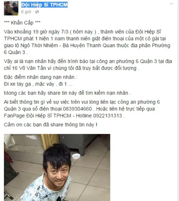 Tối 7-3, fanpage Đội Hiệp sĩ TP.HCM đăng tin tìm nạn nhân trong vụ cướp giật trên.