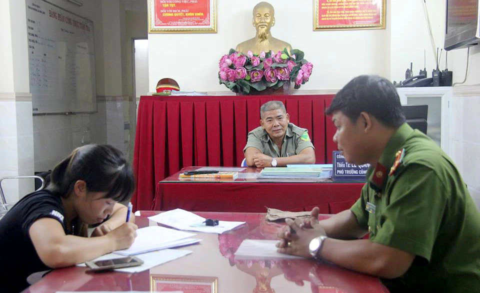 Chị Hương viết tường trình tại cơ quan công an. Ảnh: THANH TIÊN