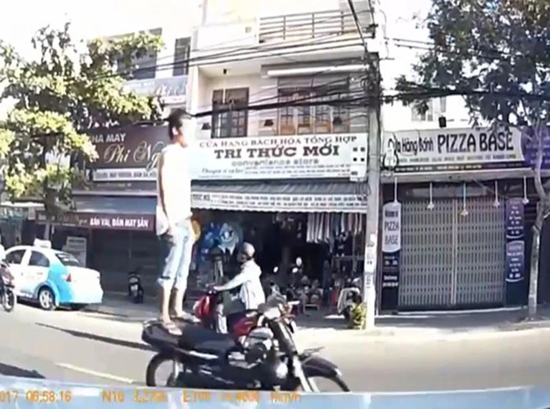 Như báo Pháp Luật TP HCM đã đưa tin, vào hôm 4-8, một tài khoản facebook đăng tải clip “lái xe bằng chân” ghi lại từ camera hành trình của ô tô về một thanh niên không đội mũ bảo hiểm, đứng thẳng người trên yên xe máy và lao vun vút trên đoạn đường có rất đông phương tiện đang lưu thông.