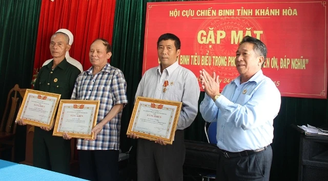 Ông Đào Thiện Sính nhận bằng khen của Trung ương Hội Cựu chiến binh Việt Nam (đầu hàng, áo sẫm).