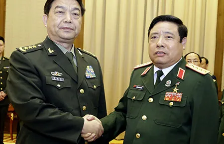 Ngày 19-5 tại Nay Pyi Taw (Myanmar), Bộ trưởng Quốc phòng Việt Nam Phùng Quang Thanh (phải) gặp Bộ trưởng Quốc phòng Trung Quốc Thường Vạn Toàn bên lề hội nghị. Ảnh: THX - TTXVN