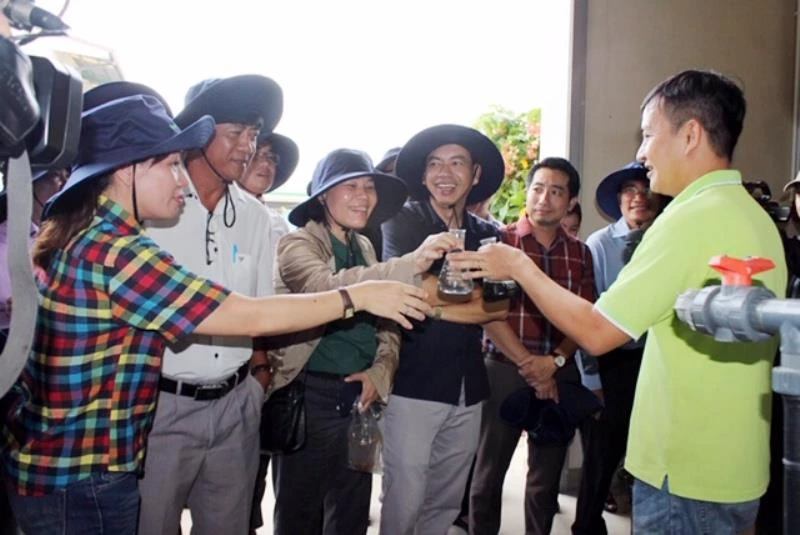 Các cán bộ tận mắt chứng kiến quy trình xử lý và lọc sạch từ nguồn nước rỉ rác đen ngòm sang ly nước trong vắt.