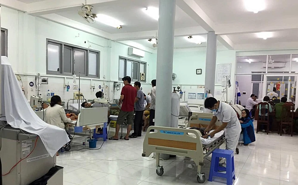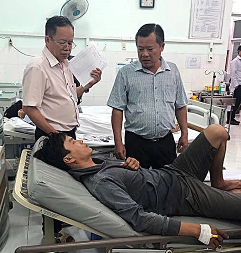 Ông Phạm Trọng Nhân, Chủ tịch thị xã La Gi (phải), đi thăm những nạn nhân đang cấp cứu.