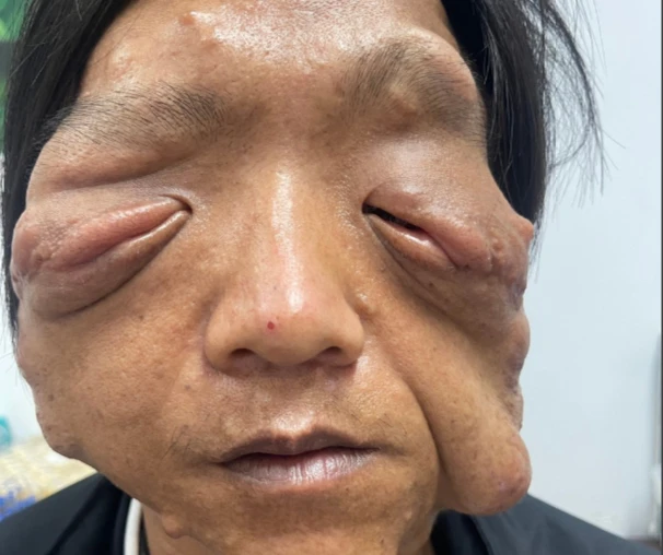 Trước đó, BV nói trên tiếp nhận anh Pu trong tình trạng khối u ở mặt phát triển phì đại. Khối u nửa mặt trái có diện tích 15x10 cm, khối u nửa mặt phải có diện tích 10x10 cm. Toàn bộ khối u kéo sụp xuống cả hai mắt gây chèn ép hốc mắt, sụp mí hoàn toàn và gây ra những cơn đau buốt.