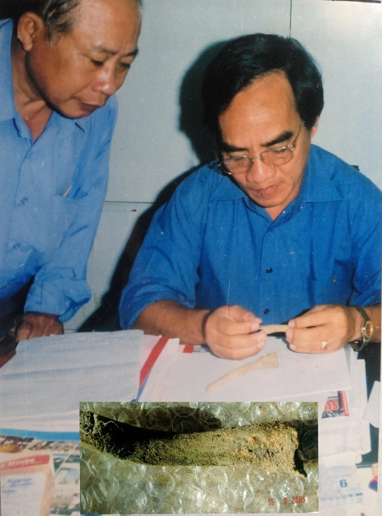 Ông Đức (đứng) và GS-BS Phan Bảo Khánh (ngồi) đang nghiên cứu mảnh xương quai xanh. Mảnh xương quai xanh ngả màu xanh đồng (ảnh nhỏ bên dưới). (Ảnh do ông Nguyễn Thiện Đức cung cấp)