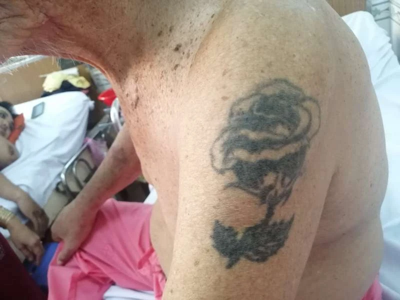 Cận cảnh hình xăm bông hồng trên cánh tay cụ ông. Ảnh: HL