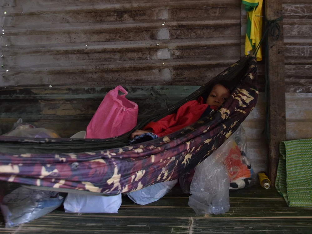 Tận dụng không gian nhỏ hẹp, người dân mắc võng để các em nhỏ có được giấc ngủ ngon. Ảnh: THANH NHẬT