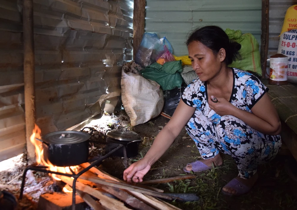 Bà Đinh Thị Hải (40 tuổi, ngụ làng Tăk Pát) nấu cơm ngay trong căn nhà tạm bợ. Ảnh: THANH NHẬT