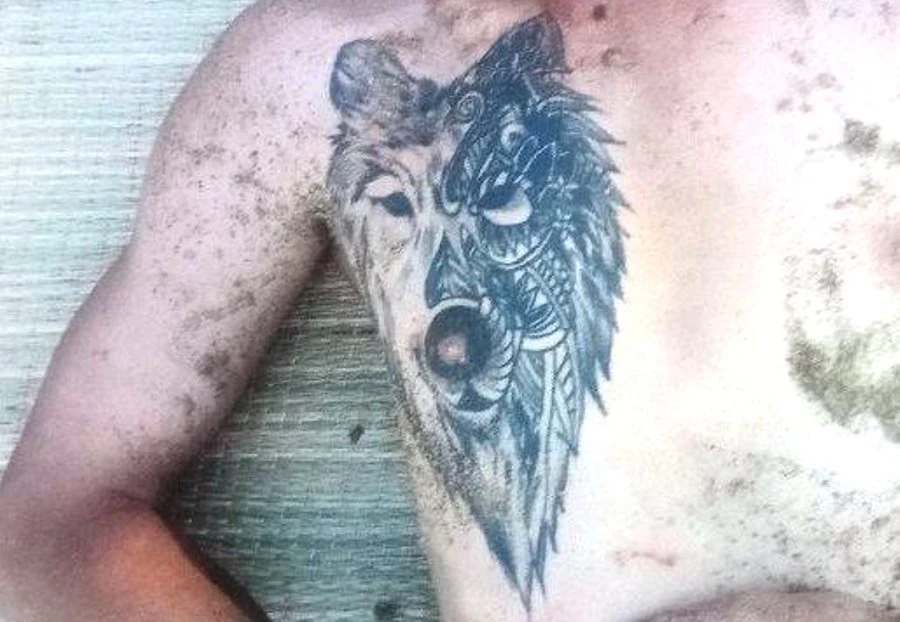 Trên ngực nam thanh niên này có hình xăm đầu con chó sói, trên cánh tay trái có xăm hình la bàn và trên cánh tay phải mặt trong có xăm hình đầu con chó.