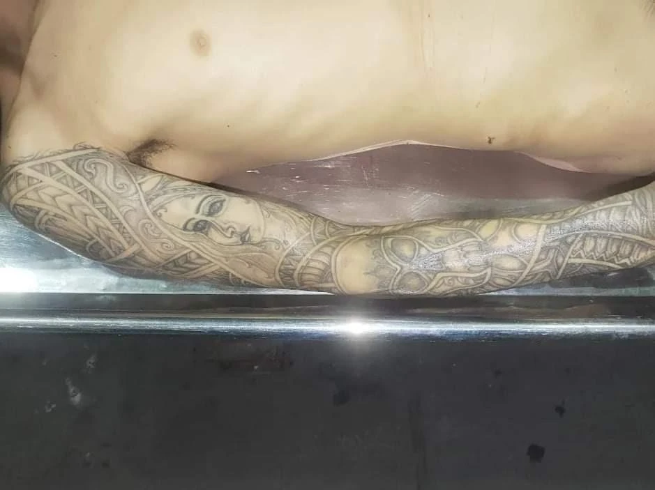 Trên cánh tay phải từ vai đến cổ tay nạn nhân có hình xăm kín dạng mặt người, không có giấy tờ tùy thân... Ảnh: NY