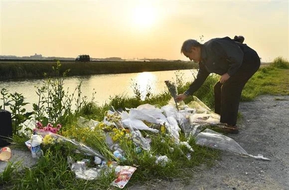Một người đàn ông cầu nguyện tại bờ kênh nơi phát hiện thi thể bé Nhật Linh ở TP Abiko, tỉnh Chiba. Ảnh: ASAHI