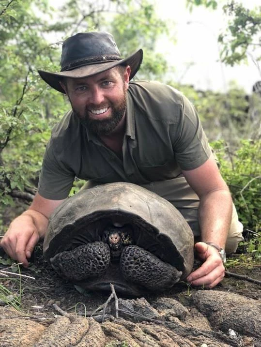 Nhà thám hiểm Forrest Galante bên cạnh cô rùa Fernandina cứ ngỡ bị tuyệt chủng trong 113 năm. Ảnh: FOXNEWS