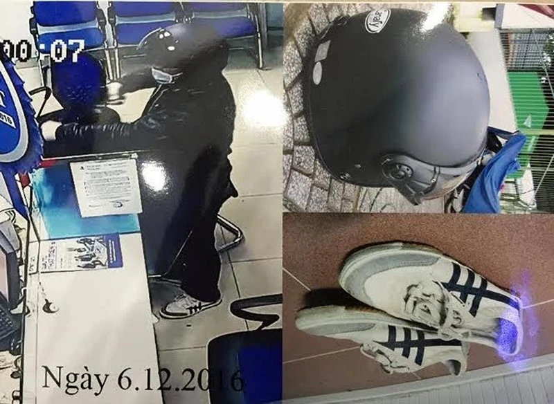 Cũng trong ngày hôm nay, cơ quan công an đã cung cấp thông tin về đối tượng cướp tại chi nhánh Ngân hàng BIDV là nam thanh niên khoảng 25-35 tuổi, cao khoảng 1,7 m, mang túi xách màu đen, đội mũ bảo hiểm màu đen có gương chắn gió màu đen phía trước, mặc áo da màu đen, quần jean màu tối, đi giày bata trắng có sọc xanh phía sau.