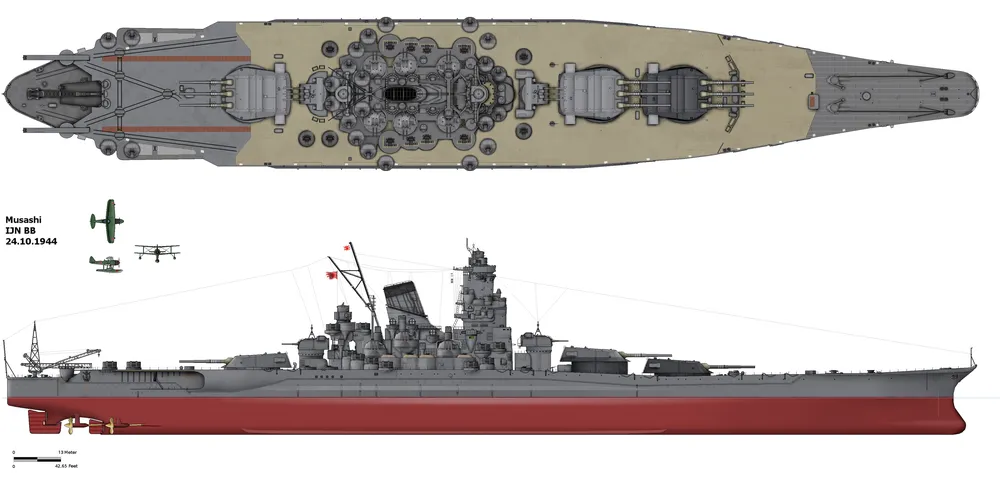 Tàu chiến Musashi nằm trong bộ ba tàu chiến được Nhật Bản xây dựng trong Thế chiến 2, với mỗi chiếc đạt tới 263 mét, là những con tàu “khủng” nhất từ trước tới nay.