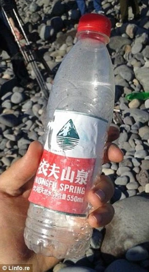 Một chai nước nhãn hiệu Trung Quốc và chai dung dịch vệ sinh Indonesia giạt vào đảo Reunion nơi tìm thấy mảnh vỡ có thể thuộc về MH370 tuần này.