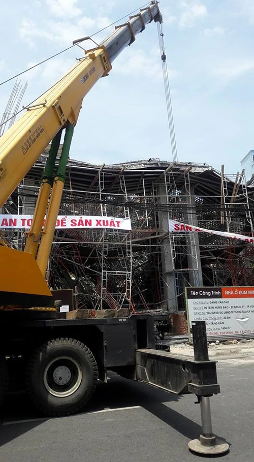 Đến 11 giờ, một số công nhân cho hay: Khi đang đổ bê tông sàn hồ bơi của công trình thì giàn giáo sập. Lúc này có hơn 10 công nhân thi công phía trên giàn giáo và họ may mắn chỉ bị trầy xước. Riêng phía dưới có hai nữ công nhân đang làm việc và hai người này bị kẹt.