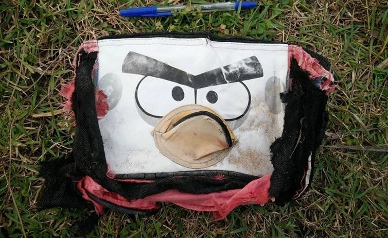 Chiếc túi có in hình con chim "Angry Bird" nghi là của nạn nhân MH370. Ảnh: Blaine Gibson