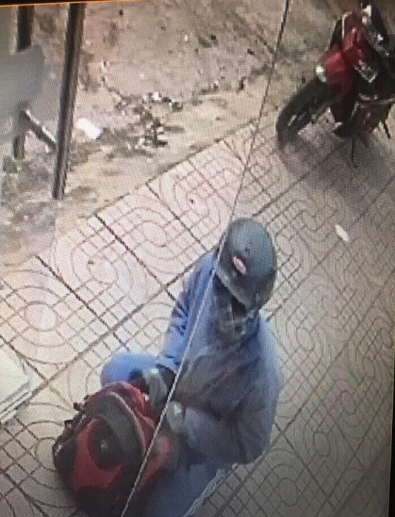 Khi thực hiện vụ cướp, nghi phạm mặc áo khoác màu đen, quần thể dục có 3 sọc trắng, đeo khẩu trang kín mặt, đi xe máy hiệu Sirius màu đỏ đen và không biển số xe.