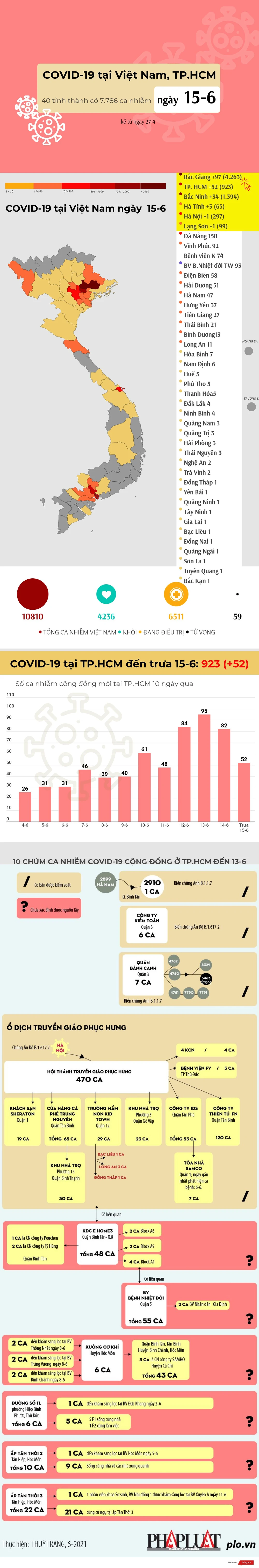 (PLO)- Theo Bản tin COVID-19 của Bộ Y tế trưa 15-6, 40 tỉnh thành của Việt Nam đã có 7.786 ca nhiễm cộng đồng. Riêng tại TP.HCM đợt 4 là 923 ca cộng đồng.