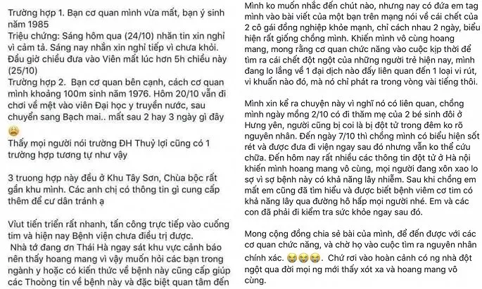“Bạn cơ quan bên cạnh, cách cơ quan mình khoảng 100 m sinh năm 1976. Hôm 20-10 đi chơi về mệt, vào viện ĐH Y truyền nước và BV Bạch Mai cấp cứu nhưng không qua khỏi sau 2-3 ngày... Virus tiến triển rất nhanh, tấn công trực tiếp vào cuống tim và hiện nay BV chưa điều trị được” - chủ tài khoản này cho biết.