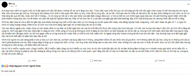Cụ thể, một tài khoản tên Bui Ly chia sẻ: "Ai trong hoàn cảnh có người thân ra đi đột ngột mới hiểu được nỗi sợ và lo lắng... Từ khi chồng mình chết vì liên quan đến viêm cơ tim, mình đã vô cùng sốc, sợ hãi và lao vào tìm hiểu về căn bệnh đó. Mình đọc được thông tin virus viêm cơ tim có khả năng lây qua hô hấp hoặc dịch tiết ở miệng. Mình vô cùng sợ hãi và lo cho sức khỏe của bản thân cùng hai đứa con, vì hơn ai hết mẹ con mình ngày ngày tiếp xúc với anh thường xuyên nhất. Mình đã đưa các con đi khám, kết quả xét nghiệm cho thấy chỉ số men tim ở hai con đều cao gần gấp đôi bình thường. Bác sĩ bảo không sao nhưng mình vẫn không hết lo lắng".