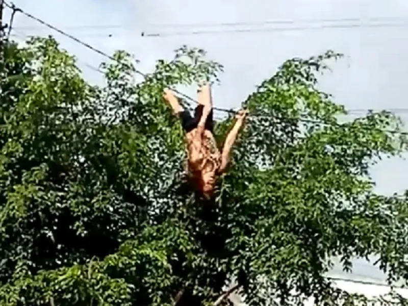 Người phụ nữ đu dây điện. (Ảnh cắt từ clip)