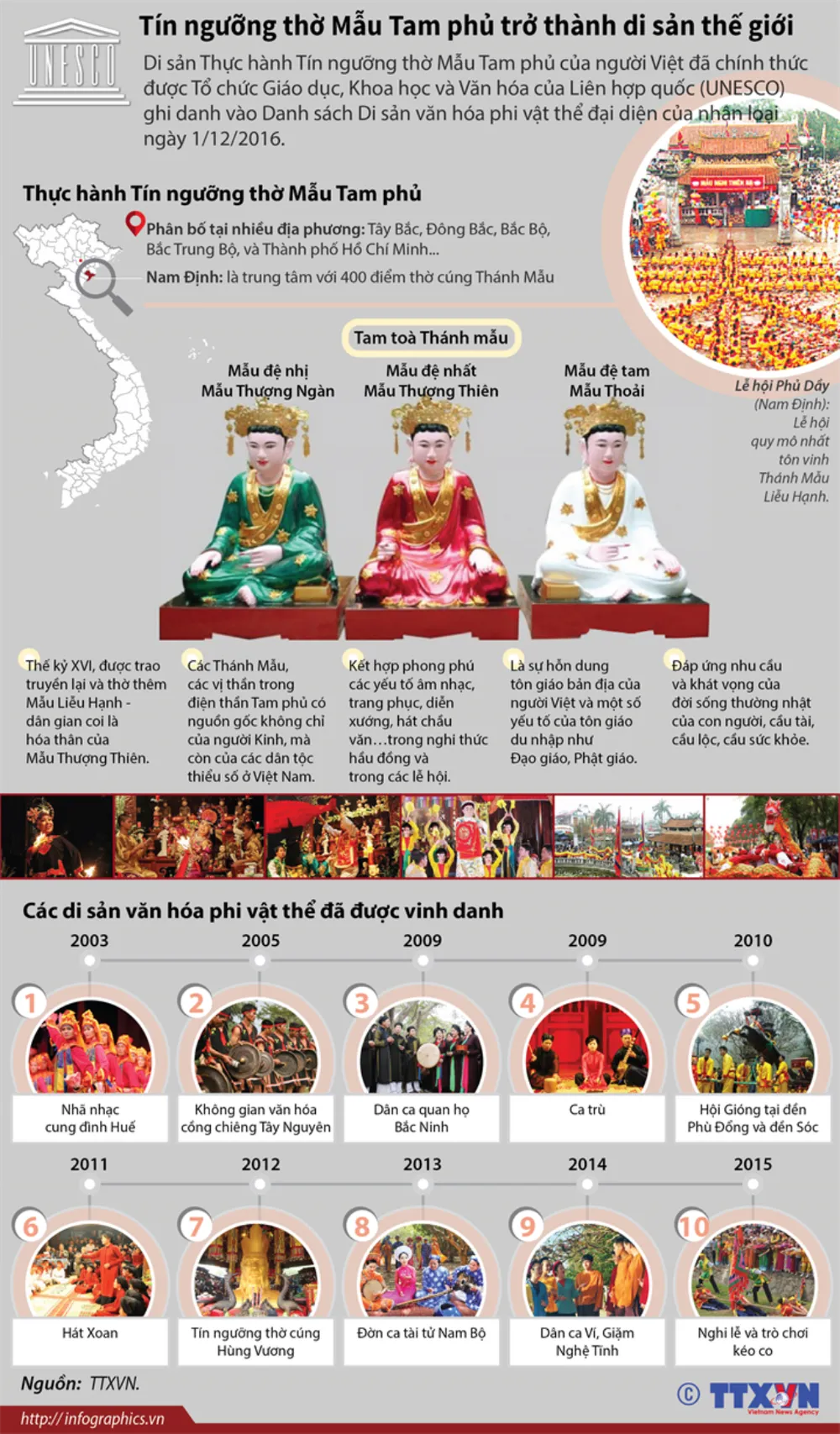 Di sản Thực hành Tín ngưỡng thờ Mẫu Tam phủ của người Việt đã chính thức được Tổ chức Giáo dục, Khoa học và Văn hóa của Liên hợp quốc (UNESCO) ghi danh vào Danh sách Di sản văn hóa phi vật thể đại diện của nhân loại ngày 1/12/2016.