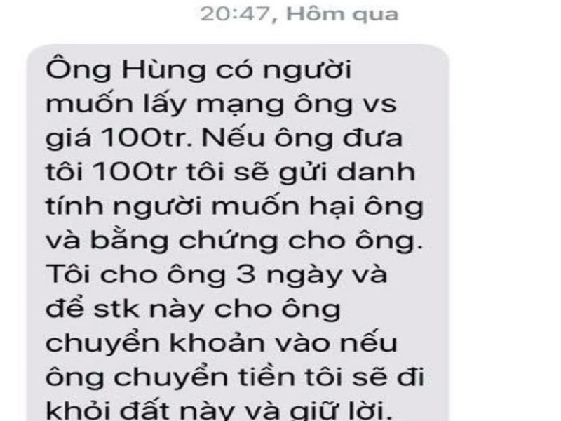Trong đơn trình báo tội phạm, ông Dương Thế Hùng nêu rõ vào lúc 20 giờ 47 phút tối 15-10, ông có nhận được tin nhắn từ số điện thoại +849013... với nội dung: "Ông Hùng có người muốn lấy mạng ông vs (với) giá 100tr. Nếu ông cho tôi 100tr tôi sẽ gửi danh tính người muốn hại ông và bằng chức cho ông. Tôi cho ông 3 ngày và để stk này cho ông chuyển khoản và nếu ông chuyển tiền tôi sẽ đi khỏi đất này và giữ lời. Số tk 060195701... Sacombank".