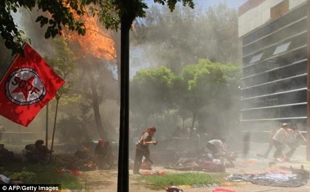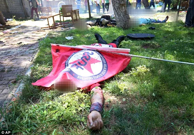 Hình ảnh từ hiện trường cho thấy các thi thể nạn nhân nằm la liệt bên cạnh các gốc cây bên ngoài một trung tâm văn hóa nằm ở thị trấn chủ yếu có người Kurd sinh sống tại phía Đông Nam của đất nước.