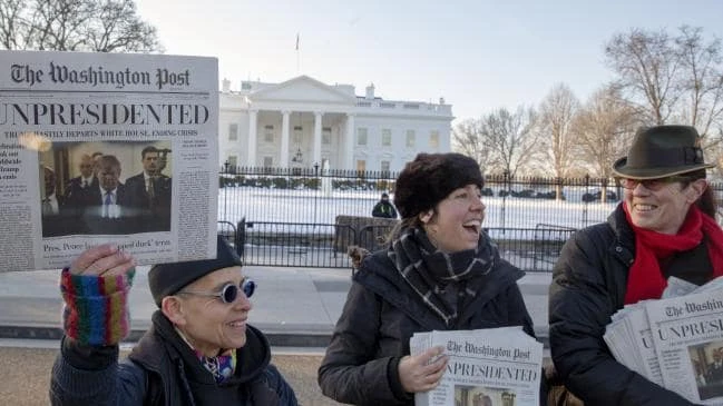 Một tổ chức phi chính phủ sáng 17-1 (giờ Mỹ) đã in và phát hành các tờ The Washington Post giả mạo cho người đi đường gần Nhà Trắng.
