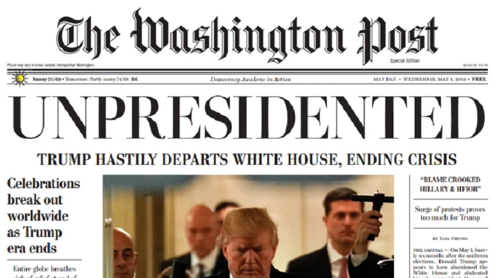 Theo thông tin đăng trên bài báo giả mạo, việc Tổng thống Trump từ chức kéo theo làn sóng ăn mừng trên toàn cầu, trong khi các nước châu Âu từ chối cho ông Trump nương náu. Tờ báo giả mạo bám sát phong cách của tờ The Washington Post nguyên bản, kể về "sự thông đồng của Nga" qua việc ông Trump tìm được "thiên đường trú ẩn" là bán đảo Crimea thuộc Nga.